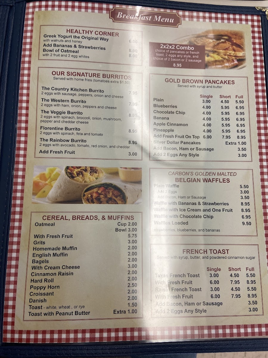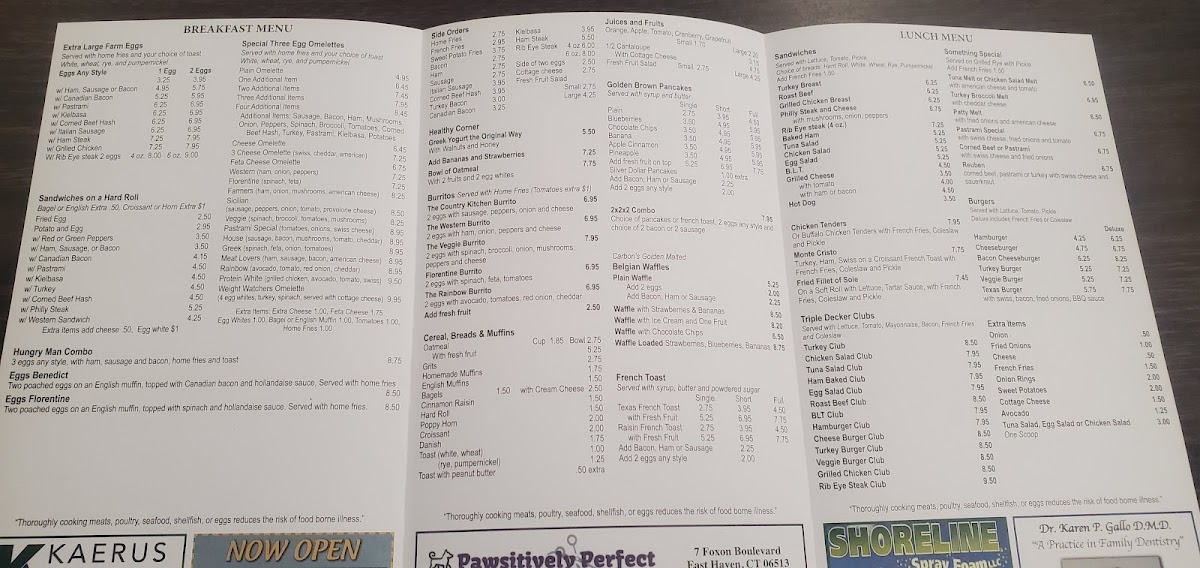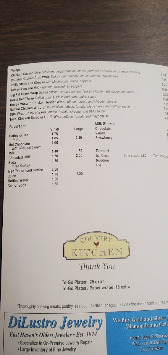Country Kitchen offers a straightforward, comforting menu that fits the feel of a cozy neighborhood spot. The selection features classic American dishes alongside casual bites perfect for any time of day. Whether you’re stopping by for a satisfying breakfast of eggs Benedict or raisin French toast, or a hearty lunch with a turkey avocado panini or grilled chicken Caesar salad, the menu supports a relaxed and inviting atmosphere.